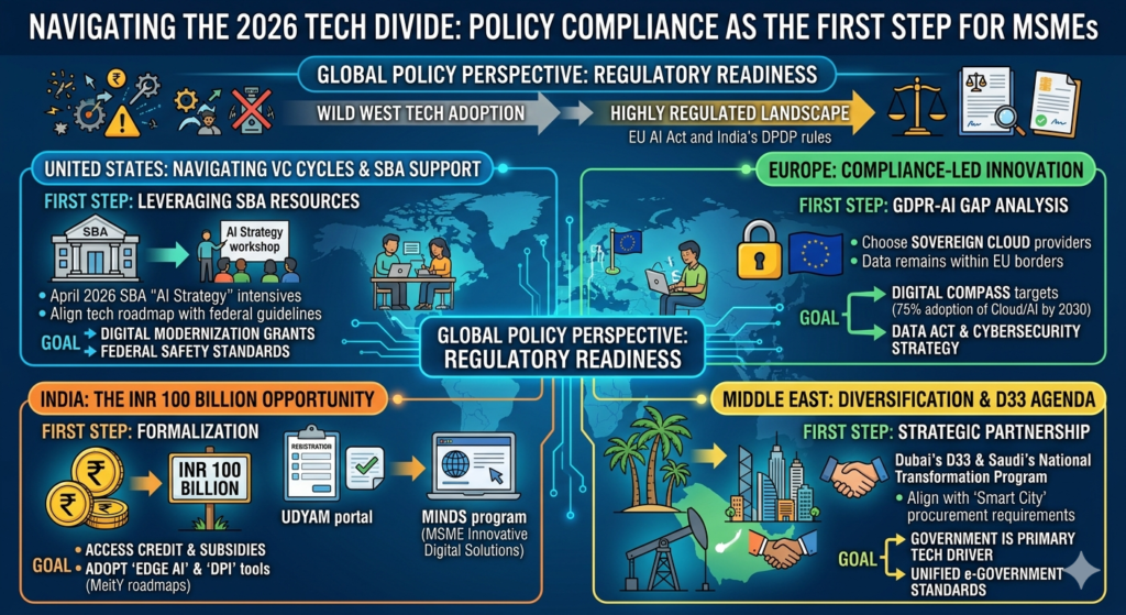 From a global policy perspective, the first step for MSMEs is Regulatory Readiness. We are moving from a “Wild West” era of tech adoption to a highly regulated landscape. Whether it’s the EU AI Act or India’s Digital Personal Data Protection (DPDP) rules, your technology strategy is now a compliance strategy.