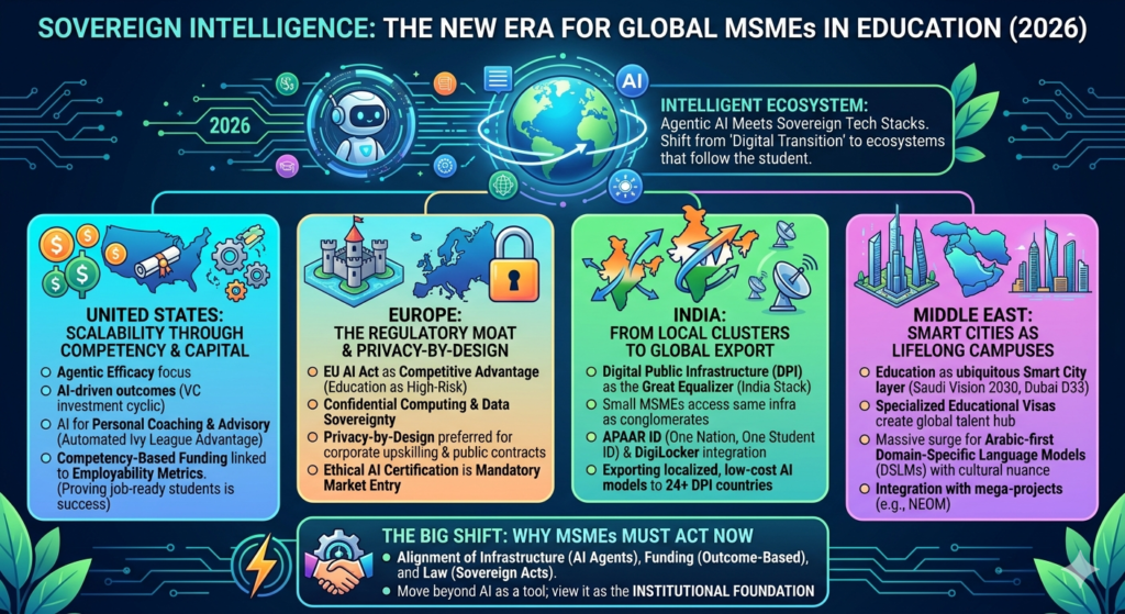 For the global MSME in education, the window of “digital transition” has officially closed. We have entered the era of Sovereign Intelligence. In 2026, the convergence of Agentic AI and rigorous regional policy has transformed education from a service you “log into” to an intelligent ecosystem that follows the student.
